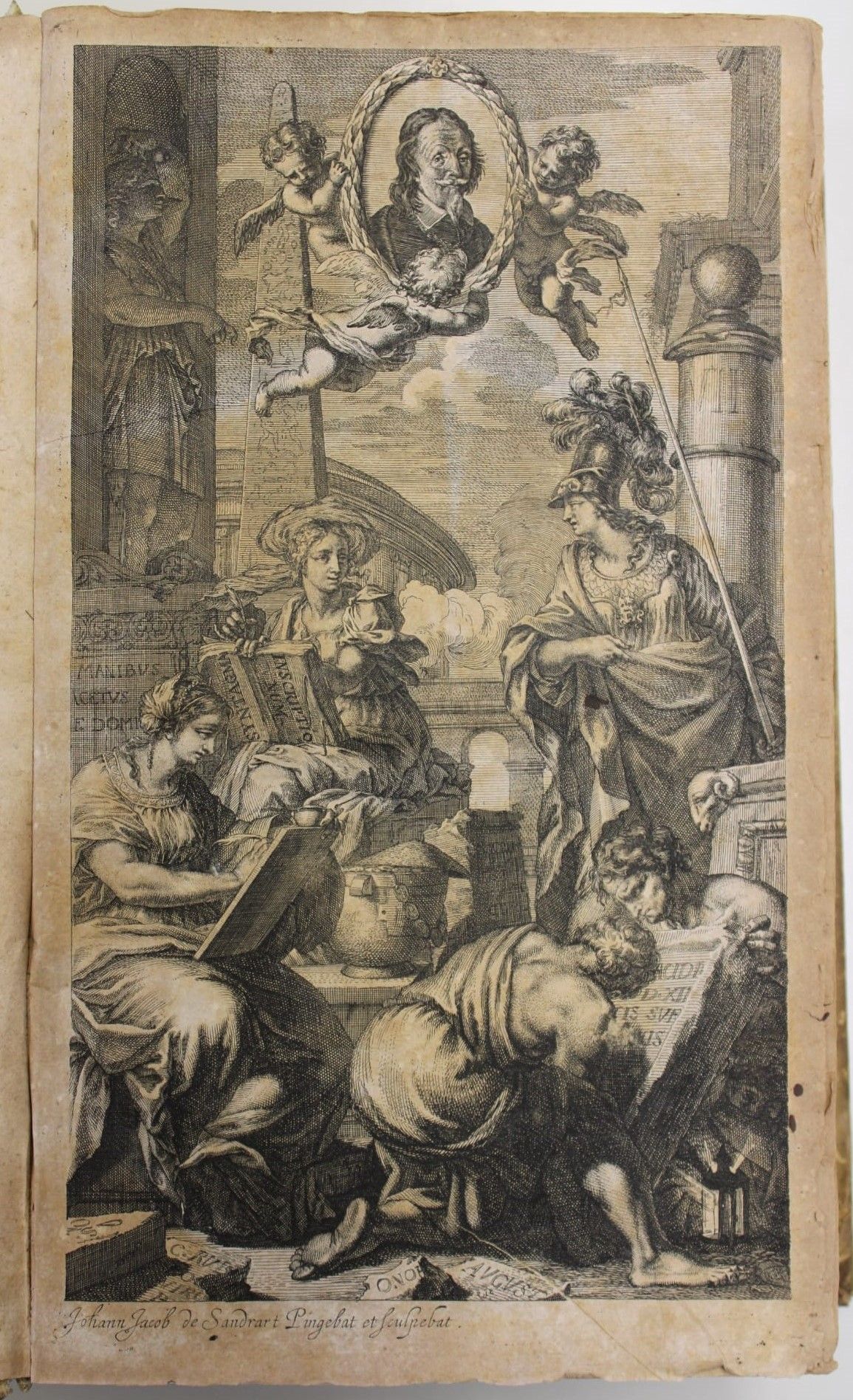 (II.1) Frontespizio in stile neoclassico, realizzato da Johann Jacob von Sandrart, ritrattista, incisore e illustratore di edizioni abile e prolifico, noto come il ‘Vasari tedesco’, fondatore dell’ Accademia delle Belle Arti di Norimberga.