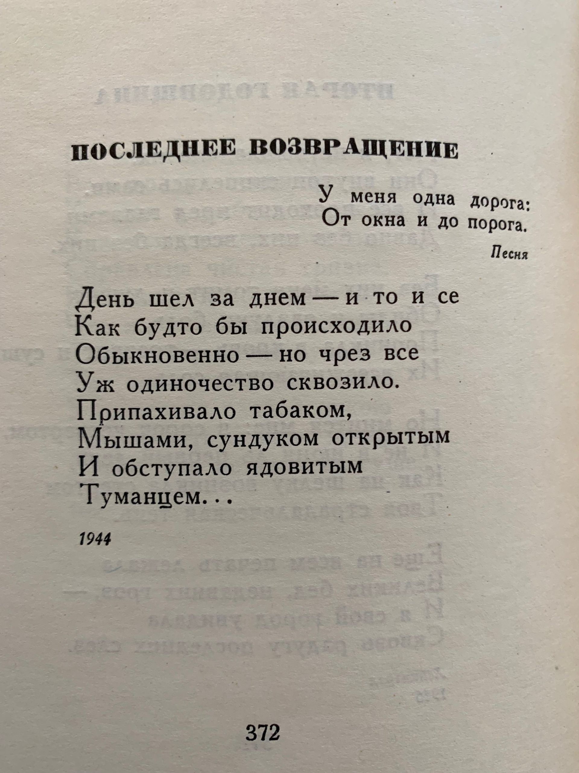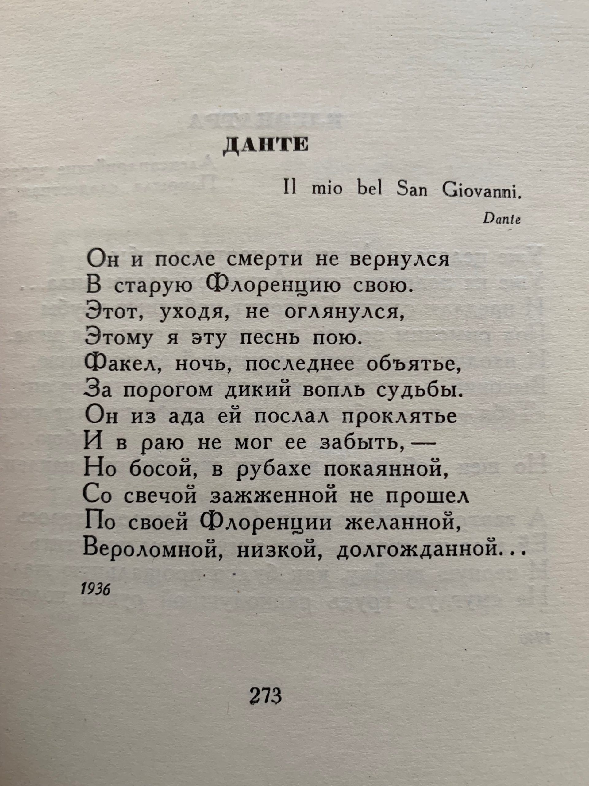 Nell’occhietto dell’edizione di una sua raccolta di componimenti (Teca VIII 4), che racconta il pregio e il valore singolare di questi volumi, la “poeta” (come preferiva essere chiamata) russa Anna Ahmatova appone una dedica al Prof. Carlo Riccio – dal cui fondo proviene il volume qui esposto – che l’aveva raggiunta a Leningrado e si apprestava a rientrare in Italia: «Al caro Carlo Riccio, Da leggere strada facendo, Con amicizia, Anna Ahmatova, 3 ottobre 1965, Leningrado». Anna Ahmatova è la voce nostalgica di un passato ormai lontano, in cui è costante il motivo tragico del triste destino della sua patria Russia, dove, con dolore, ricerca disperatamente la bontà degli uomini.